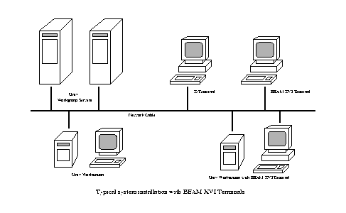 The BEAM XVI Terminal is connected to the computing systems by means of an Ethernet network cable. Both 10Base2 and 10BaseT networks are supported.